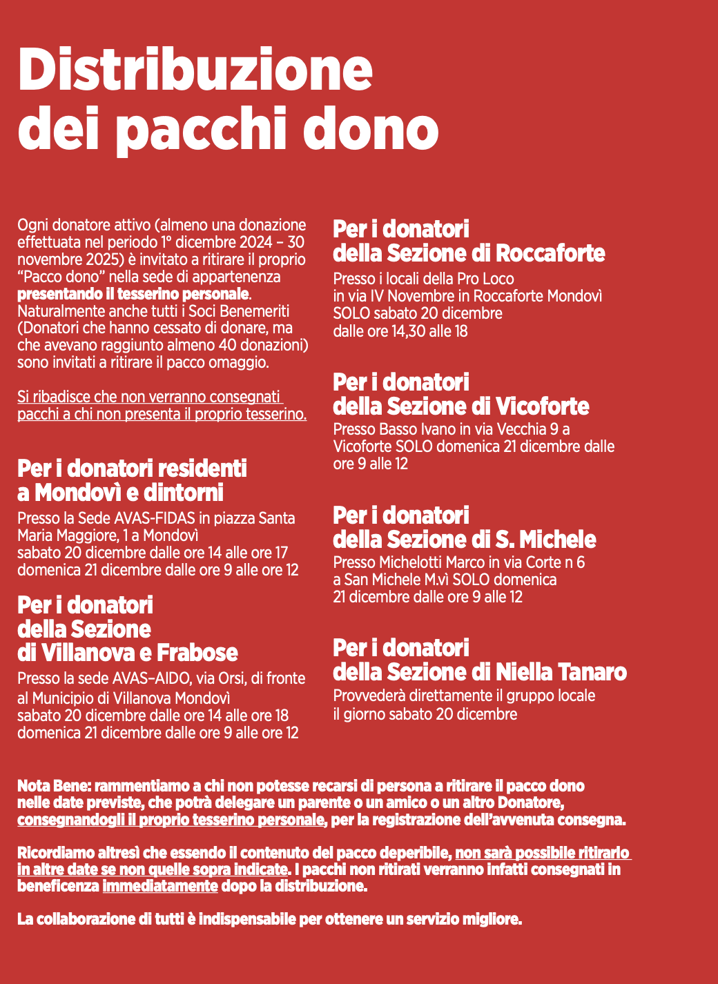 Di seguito anche il dettaglio con le informazioni specifiche per la consegna dei pacchi dono per le varie sezioni.