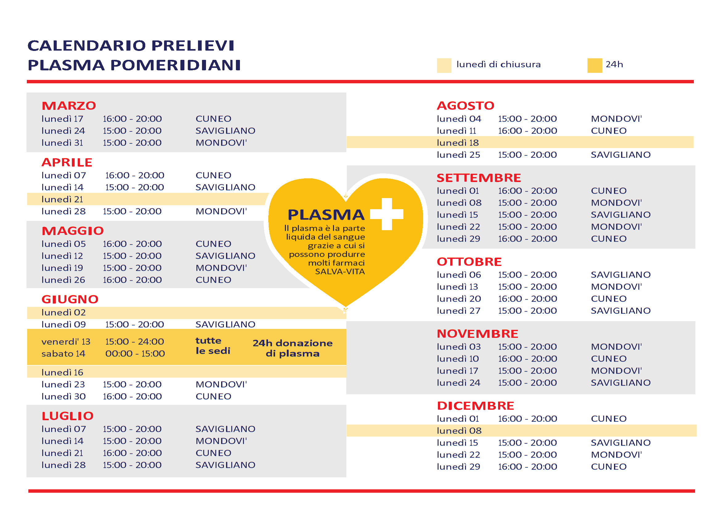 Con l’obiettivo di aumentare le raccolte di plasma, sono state previste delle aperture pomeridiane straordinarie negli ospedali dell’A.S.L. CN1 di Mondovi‘, Cuneo e Savigliano.